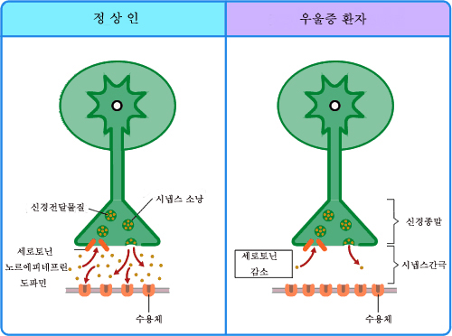 노르에피네프린(norepinephrine: NE). 노르에피네프린은 아세틸콜린처럼 자율신경계 뉴런에서 발견되기 때문에 많은 실험적 관심을 받았다. 일반적으로 자율신경계의 교감신경계에서 주로 사용하는 노르에피네프린은 각성과 정서행동을 조절하는 기능을 한다(Pools, 1980). 그래서 우울증과 같은 정서적 장애는 노르에피네프린과 도파민의 부족과 관련된다(Weiss et al., 1981). 우울증 환자를 치료하는 데 사용하는 일부 항우울제는 주로 노르에피네프린계에 작용한다. 조울증 환자가 조증 상태에 있을 때는 리튬(lithium)을 투여하는데, 이것은 시냅스 간격에 방출된 노르에피네프린의 재흡수를 촉진한다(Goodwin et al., 1972). 여기서 조증은 자기 도취감에 빠져 지나치게 말을 많이 하고 판단력이 상실되는 등의 증상을 보이는 정서적 장애이다.