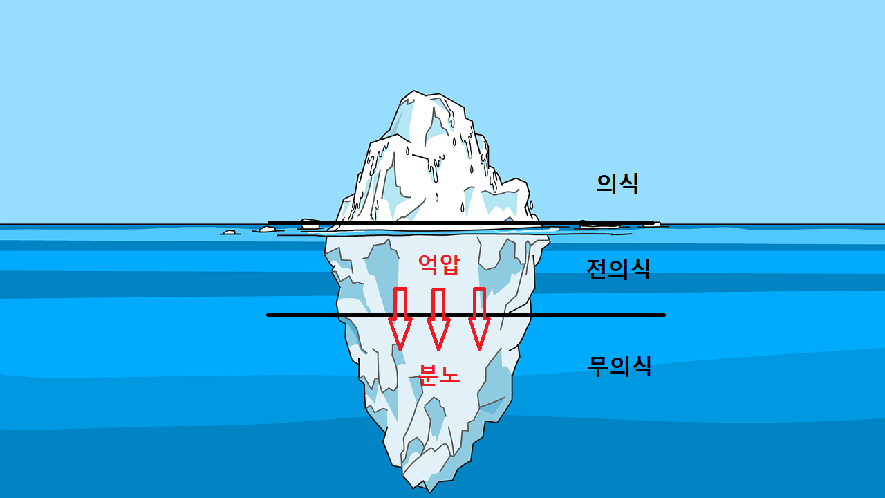 이렇듯 Freud(1935)의 신념은 마음의 대부분이 숨어 있고 의식적으로 알 수 있는 부분은 수면 위로 떠 있는 빙산의 일각이라는 것이다. 수면 아래에 훨씬 큰 무의식이 존재하는데, 여기에는 우리가 자각하지 못하는 사고, 소망, 감정, 기억 등이 들어 있다고 보았다. Freud는 이러한 무의식적 내용 중에서도 사람들이 인정하기에는 너무 위협적이어서 일부러 억압함으로써 의식으로부터 강제로 몰아내는, 용납할 수 없는 사고에 대해 많은 관심을 가졌다. 그는 의식적으로 자각할 수는 없어도 골치 아픈 감정과 생각들이 사람들에게 강력한 영향력을 행사하며, 때로는 사람들이 선택하는 일, 가지고 있는 신념, 일상 습관, 불안 징후 등과 같이 위장된 형태로 표현되기도 한다고 믿었다. 그래서 그는 사람들이 이전에 의식하지 못한 감정과 갈등을 발견하도록 도와주는 것이 정신 분석이 할 일이라고 보았다.